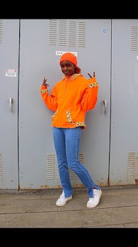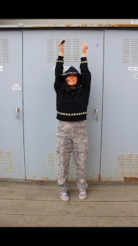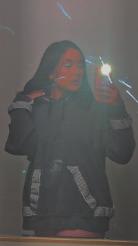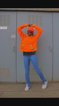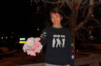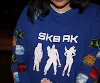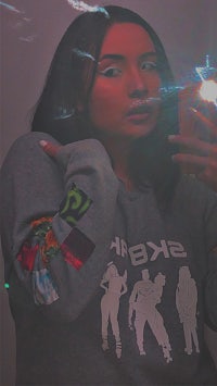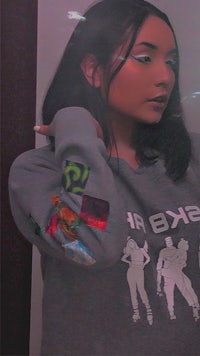 Has checkered pattern on sleeves consisting of green flames, clouds, sunflowers, & thunder+bats😈 has unique 1/1 pattern screen printed on front designed by urs truly